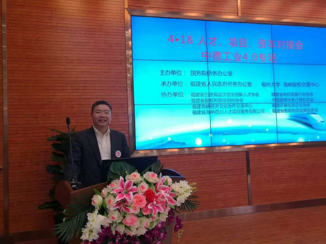 4月18日福建省电机电器行业协会联合国务院侨务办公室、福建省人民政府侨务办公室、福州大学、海峡股权交易中心、福建省高层次创业创新人才协会、福建侨商投资企业协会、中国留德学者计算机学会、福建海峡经济文化交流中心、福建省智能智造发展促进会、福建省海纳百川人才项目服务有限公司等在福州大学先进控制技术研究中心隆重举行2016年第三次“4•18”人才、项目、资本对接会--中德工业4.0专场。国务院侨务办公室卢立波处长、福建省侨办陈晓处长、福建省引进高层次创业创新人才协会周盛宗秘书长、福建省委组织部人才办赵永莉高级工程师、海峡股权交易中心总经理张赞松先生受邀出席了本次会议。会议主题是整合国家“千人计划”人才资源,促进我省电机电器行业“工业4.0”相关领域人才对接、项目对接、资本对接。