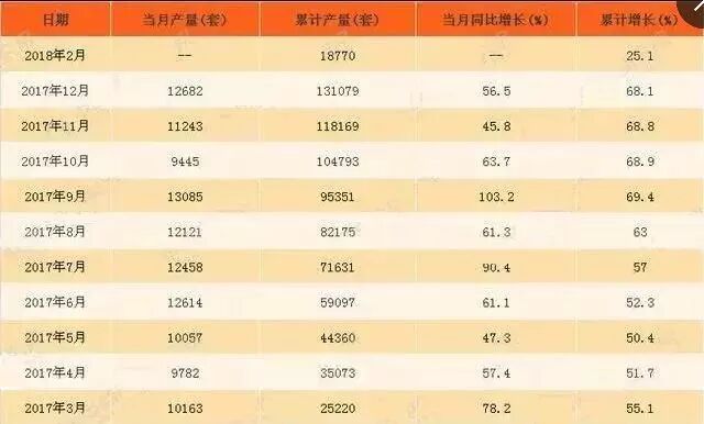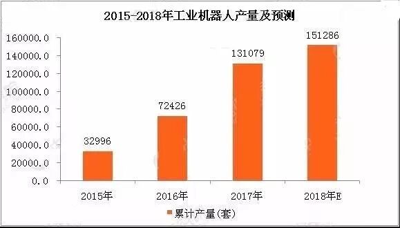 1.工业机器人产量情况 据中商产业研究院发布的《2018-2023年中国工业机器人市场前景及投资机会研究报告》,数据显示,2017全年中国工业机器人产量达到131079套,预计2018年工业机器人产量将达到151286套。 2.2018年1-2月产量累计增长25.1% 根据中商产业研究院大数据库,2018年1-2月中国工业机器人产量统计显示,2018年1-2月中国工业机器人累计产量为18770套,累计增长25.1%。 2018年1-2月中国工业机器人产量统计情况 3.工业机器人销量情况 2013年,中国工业机器人购买量已超过3万台,位居全球首位。根据IFR显示,2016年中国工业机器人销量9万台,同比增长31%,远高于14%的世界平均增速。高工产研机器人研究所(GGII)预测2017年中国工业机器人市场需求将继续保持快速增长,增速超过20%,出货量达10.6万台。 报告显示,2011年-2016年中国工业机器人销量年均复合增长率为32.1%,预计2017年中国工业机器人销量约10.58台,同比增长16.9%。 工业机器人发展前景 随着我国制造业的发展,特别是汽车及汽车零部件制造业和摩托车行业的快速发展,工业机器人的装配量将会稳固上升。此外,我国的建筑业、采矿业、铁路和公共建设、水力工程建设和工程机械、建筑机械市场的扩大也将对工业机器人产业起到推动作用。建筑工程机械的结构件多为焊接件,为提高焊接质量和效率,满足市场的需求,目前许多工程机械厂商纷纷要求采用机器人进行焊接。