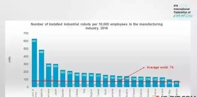 韩国,工业机器人密度全球排名第一。这个数据从2010年保持至今,其机器人密度(631台/万人 )比2015年的531个数字有了明显的增长,已超过全球平均水平的8倍,这种高增长率依赖于韩国制造业新装机器人数量,尤其是在3C和汽车行业。