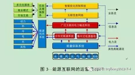 从运营关系上看,能源互联网基于业务流、信息流和能源流的深度融合,提高能源系统整体运行效率,实现供需双方的高效匹配,如图3所示。其中,能源获取系统具备智能化的新能源发电功率预测及控制能力;分布式和集中式能源传输系统具备更加准确的状态预测、调度控制和互动机制;能源利用系统具有高度信息化的特点和各类基于电力大数据的高级功能应用。各系统深度融合形成有机、开放的平台系统,电将作为介质,电力骨干网架将作为发展基础,数据信息将作为核心,多种能源和服务将在这一立体平台上实现商品化交易。