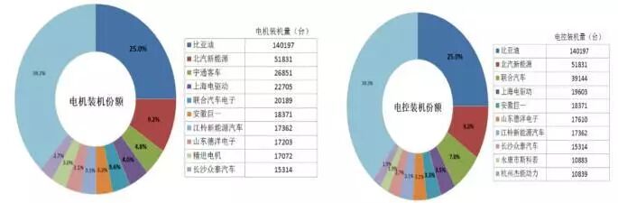 整车企业自配电机电控占到一半以上。比亚迪与北汽新能源两家车企2016年电机电控装机量分别为14.02万台和5.18万台,市场占有率合计达34.2%。第三方制造商中,上海电驱动、联合汽车电子、安徽巨一位居靠前。