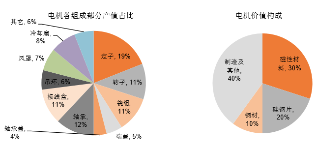 国内车用驱动电机多用永磁同步电机,原材料成本的占比较高,主要包括铁芯叠片、驱动轴体等钢材,钕铁硼等稀土永磁材料,镁铝合金以及铜材等基本金属。永磁电机核心的原材料就是钕铁硼磁材,钕铁硼磁性材料是钕、氧化铁等的合金,2015年全球钕铁硼永磁材料产量为14.3万吨,中国产量占比达到88.8%。