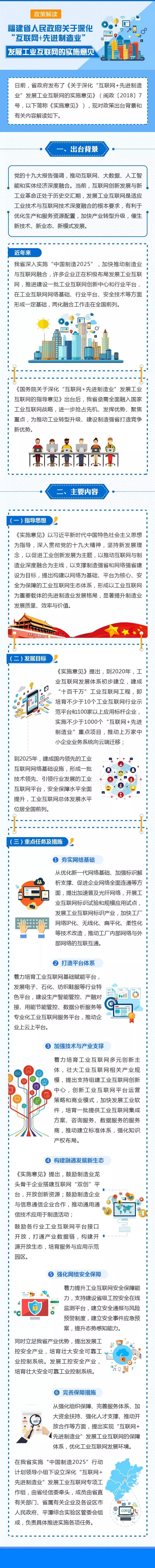 福建省人民政府关于深化“互联网+先进制造业”发展工业互联网的实施意见 闽政〔2018〕7 号 各市、县(区)人民政府,平潭综合实验区管委会,省人民政府各部门、各直属机构,各大企业,各高等院校: 为贯彻落实国务院《关于深化“互联网+先进制造业”发展工业互联网的指导意见》(国发〔2017〕50号),深化互联网与先进制造业融合,加快我省工业互联网发展,协同推进制造强省和网络强省建设,提出如下实施意见。 (一)指导思想 以习近平新时代中国特色社会主义思想为指导,深入贯彻党的十九大精神,坚持新发展理念,以促进工业创新发展为主题,以推动互联网与制造业深度融合为主线,以支撑制造强省和网络强省建设为目标,着力构建以网络为基础、平台为核心、安全为保障的工业互联网生态体系,形成以工业互联网为重要载体的先进制造业发展格局,显著提升制造业发展质量、效率与价值。 (二)基本原则 创新驱动,融通发展。遵循科技创新规律,以数字技术创新为核心驱动力,加强工业互联网关键技术攻关与典型应用推广,培育多元创新主体,完善产业创新体系。引导上下游企业、大中小企业、跨领域企业互联互通、融合发展,促进产品、技术、服务与业务的集成创新,营造高效、融通的发展环境。 市场主导,政府引导。尊重市场规律,充分发挥企业在促创新、优供给、增活力中的主体作用,激发工业互联网内生动力,实现更大范围、更高效率、更为优化的生产要素资源配置。强化政府的组织引导和协调服务,坚持整体规划、精准施策、重点突破,分行业、分区域扎实推进工业互联网发展。 开放发展,安全可控。把握安全与发展的辩证关系,发挥工业互联网开放性、交互性优势,促进资源互通、知识积累、技术共享与开放合作。严守安全底线,强化网络安全保障,构建科学严谨的工业互联网安全预警、风险处置、监管保护体系,全面提升安全保障能力。 (三)发展目标 到2020年,工业互联网发展体系初步建立,低时延、高可靠、广覆盖的工业互联网网络基础设施初步建成;通过实施“十百千万”工业互联网工程,培育形成不少于10个工业互联网行业示范平台和100家以上应用标杆企业,建设不少于1000个“互联网+先进制造业”重点项目,推动上万家中小企业业务系统向云端迁移;工业互联网安全保障体系初步形成,保障能力明显提升;网络、平台、安全三大体系互相连通、紧密协同、形成生态,新时代先进制造业发展的强劲动能充分激发。 到2025年,建成国内领先的工业互联网网络基础设施,形成一批技术领先、引领行业发展的工业互联网平台,围绕工业互联网的技术创新更加活跃、产业支撑更加有力、供给能力更加丰富、融合应用更加普及,安全保障水平全面提升,工业互联网总体发展水平位居全国前列。 (四)优化新一代网络基础。优化宽带网络基础,加速普及光纤网络,实施IPv6发展行动计划,推进低功耗广域网城乡普遍覆盖,进一步降低中小企业互联网专线接入资费水平。升级移动通信网络基础,扩大4G覆盖广度和深度,跟进发展5G网络和应用试验。推动WiFi、Zigbee、LoRa、2G/3G/LTE、NFC(近距离无线通信技术)、RFID(射频识别技术)等技术在重点地区和行业典型场景的应用,支持NB-IoT技术相关频段试验和业务试点。加大频谱保障力度,为广连接、高吞吐的工业无线通信提供频率支持。深化福州、厦门、泉州、莆田、平潭综合实验区等“宽带中国”示范城市建设,发挥福州国家级互联网骨干直联点作用,推动信息港发展。 责任单位:省通信管理局,省经信委、发改委,各设区市人民政府、平潭综合实验区管委会 (五)加强标识解析支撑。支持省内高等学校、科研机构、优势企业参与工业互联网标识解析协议、控制协议、应用协议相关工作,承接国家公共标识解析服务关键节点,开展工业互联网标识试验和规模应用试点。推动建设公共标识解析服务平台及产品信息数据库,提升面向行业的标识注册、解析、查询、搜索、备案、认证等服务能力。培育工业互联网标识产业,发挥省内二维码识别、智能POS机、RFID等技术优势,加快研发耐高温高压、高速读写、高可靠性的标识载体和感知读写设备,打造“识别产业中心”。鼓励福州软件园、厦门软件园与重点工业园区合作建立标识解析研究机构。支持企业开发工业互联网编码、解码软件,以及可实时处理多来源、多维度工业数据的数据分析软件。培育工业标识技术整体解决方案提供商,在产品追溯、大规模个性化定制等应用场景形成一批示范案例。 责任单位:省经信委、科技厅、质监局,省通信管理局,省电子信息集团,各设区市人民政府、平潭综合实验区管委会 (六)促进企业网络全面连通。加快工厂网络IP化、无线化、扁平化、柔性化等技术改造。依托智能控制器、智能模块、嵌入式软件等软硬件系统,推动工厂内部网络与外部网络的互联互通,重点实现工厂在制品、智能机器、工业控制系统等方面的内部互联,以及企业与供应链上下游企业、智能产品服务商、用户等主体的外部互通。推动重点园区、重点产业建设高质量的工业互联网网络基础设施,加快高带宽虚拟专网、工业无源光网络(PON)、4G/5G、下一代无线智能网(NGB-W)的工业应用,为园区内企业提供网络基础服务。 责任单位:省经信委、发改委,省通信管理局,各设区市人民政府、