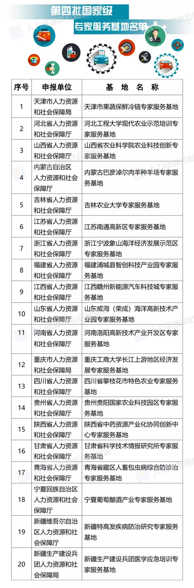 近期,人社部办公厅印发通知,公布了遴选确定的60个专家服务团项目和第四批20家国家级专家服务基地名单,每个服务团项目和每家基地分别给予10万元和20万元经费支持。