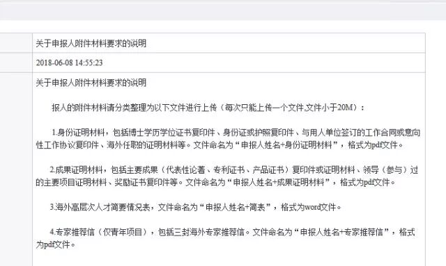 1 申报书(推荐表),由客户端生成的word文档,不可修改内容格式及文件格式; 2 上传附件材料,按系统要求分为4个主要文件和其他文件:身份证明材料、成果证明材料、海外高层次人才简要情况表、专家推荐信(仅青年项目),破格说明及上述未提及的其他材料可单独成项。 (图为:申报材料要求说明) 3 创业类项目,上图未提及的材料可以合并成一个PDF,格式和命名要求按系统要求。或放在主要成果的PDF里,也可单独成项。 4 海外高层次人才简要情况说明表在http://www.1000plan.org/qrjh/article/76291下载,附件中各自项目的文件夹内。 5 纸质材料的报送和截止时间需咨询当地各自主管部门。 6 申报书纸质材料申报单位及主管部门签字说明:(1)申报单位意见,创业项目由园区填写盖章,其他项目由用人单位填写盖章;(2)主管部门意见,可以空项不填。简表中主管部门意见1与2均可以空项。 7 电子材料签字盖章处如因无电子签名和公章或word版本兼容问题导致上传失败可以空项。 8 外专和创新短期项目申报书中日期无法填写的可以下载最新版本(版本号0625)的客户端,进行填写。下载地址:http://www.1000plan.org/qrjh/article/76291 9 6.27日上午评审平台已经更新,可以上传Excel格式的文件;申报人选情况汇总表无需上传。 10 上传文件成功之后,再次打开平台无法查看已上传的文件目录,这是正常的情况。 11 上传文件后在截止日期之前可以修改,在候选人管理中进行删除和修改操作。 12 目前上传申报书失败主要原因有: (1)申报书项目有空项,(内容校验仅能校验必填项目是否填写,全文除签字盖章外有空白项目仍会影响上传能否成功,请仔细检查核对,如项目中结合个人实际情况无内容填写需填写无) (2)账号申请时填写的单位与上传时填写的单位不符(包括大小写问题,有错别字都会导致上传失败,创业类不受影响) (3)系统繁忙,临近截止日期,网络压力较大,也会导致上传失败,可多次尝试。 看完了电子材料的相关问题,我们继续提醒一下各地纸质版材料的报送截止时间。 各地纸质材料提交截止日期 省份(直辖市、自治区) 纸质材料提交截止日期 陕西省 6月20日 海南省 6月22日 重庆市 市属单位顶尖人才项目6月22 日,其他项目7月5日;中央在渝申报外专项目外7月5日其余项目7月12日 天津市 6月25日 湖南省 6月25日 黑龙江省 6月28日 宁夏回族自治区 6月29日 安徽省 6月30日 四川省 6月30日 吉林省 除青千外6月30日,青千7月13日 内蒙古自治区 7月3日(顶尖人才与创新团队项目随时申报) 河南省 7月3日 云南 7月5日 福建省 7月5日 广西壮族自治区 7月5日 山西省 7月5日 河北省 7月6日 深圳市 7月6日 湖北省 7月6日 辽宁省 7月6日 江苏省 7月9日 上海市 7月10日 山东省 创业人才、创新人才项目7月10日,其它项目7月13日 北京市 7月12日 广东省 7月13日 浙江省 7月15日