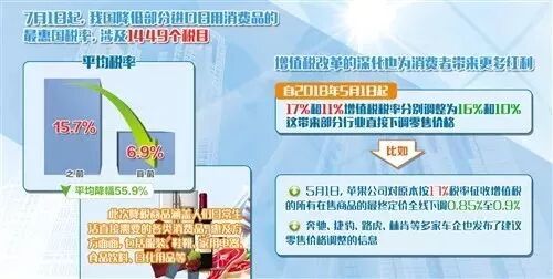 增值税改革的深化也为消费者带来更多红利。自2018年5月1日起,17%和11%增值税税率分别调整为16%和10%。这部分行业直接下调了零售价格。比如,5月1日,苹果公司对原本按17%税率征收增值税的所有在售商品最终定价全线下调0.85%至0.9%。奔驰、捷豹、路虎、林肯等多家车企也发布了建议零售价格调整的信息。