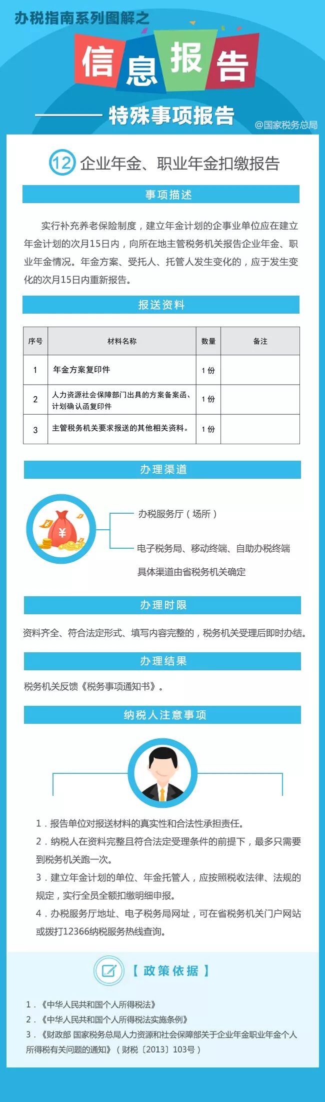 为了方便纳税人办税,我们将陆续为您梳理发布各类办税事项的报送资料、办理渠道、办理时限、注意事项等内容,记得关注收藏哦!今天发布:特殊事项报告类办税指南之企业年金、职业年金扣缴报告↓